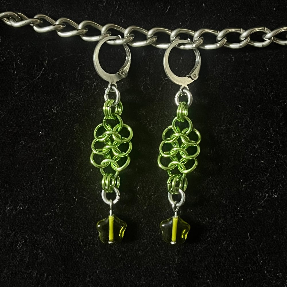 Anodised aluminium green chainmail earrings with green glass stars