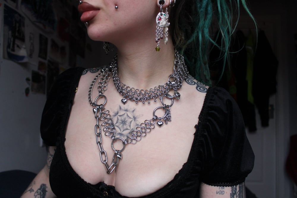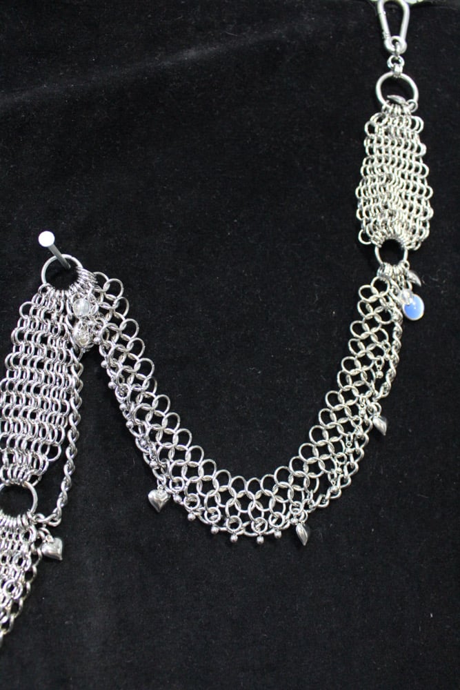 Dripped out in stainless steel chainmail, chains, charms and crystal quartz.