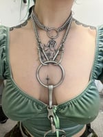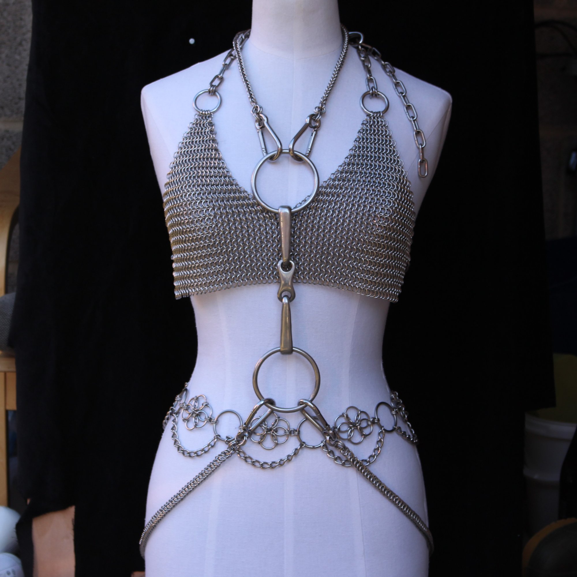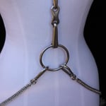 Upcycled second hand horsebit centre piece. Two stainless steel chainmail chains that connect to the O rings with high quality stainless steel carabenas.