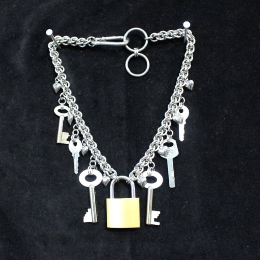 Handmade stainless steel chainmail necklace with keys, love hearts and a padlock.
