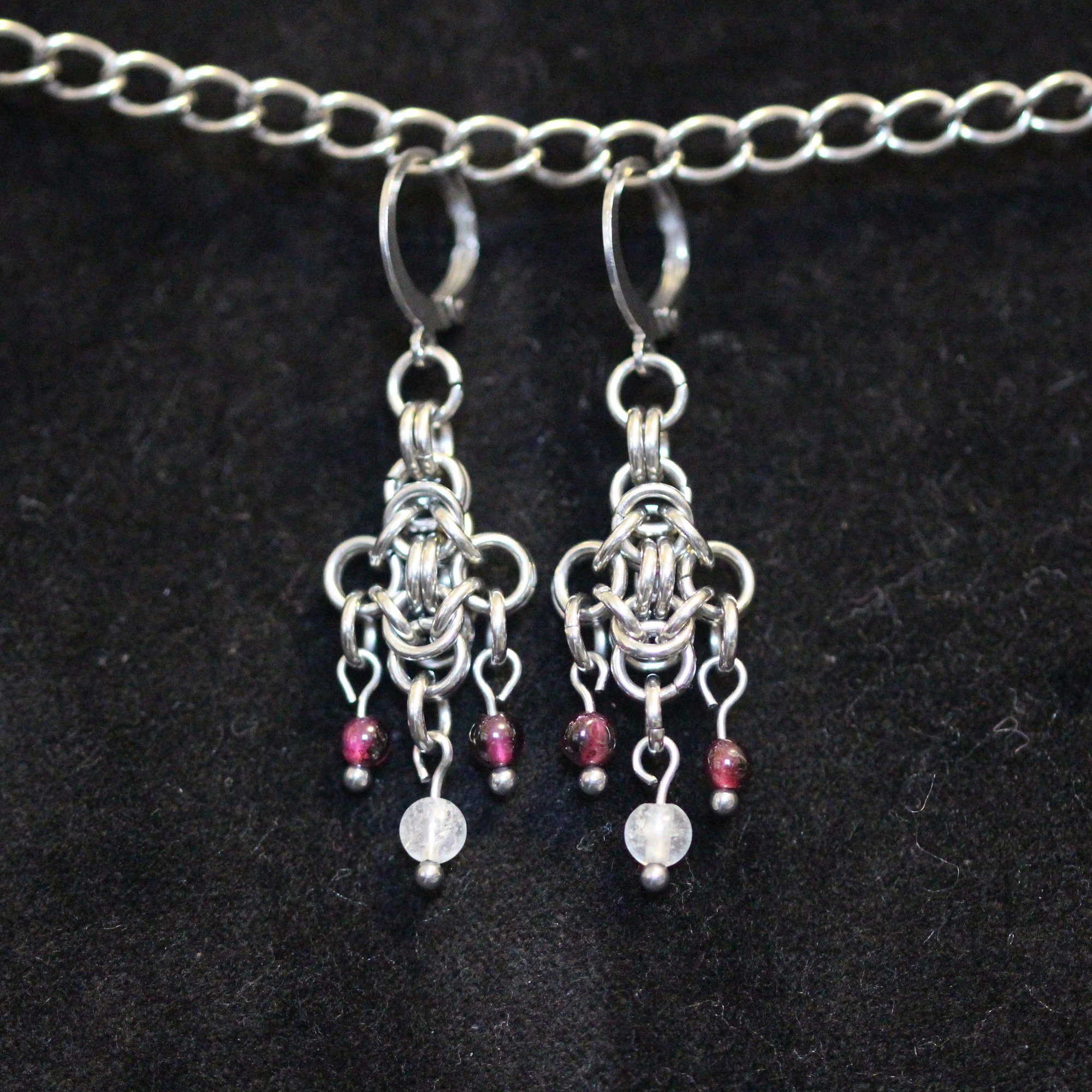 Stainless steel chainmail xtal quartz and garnet earrings