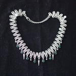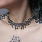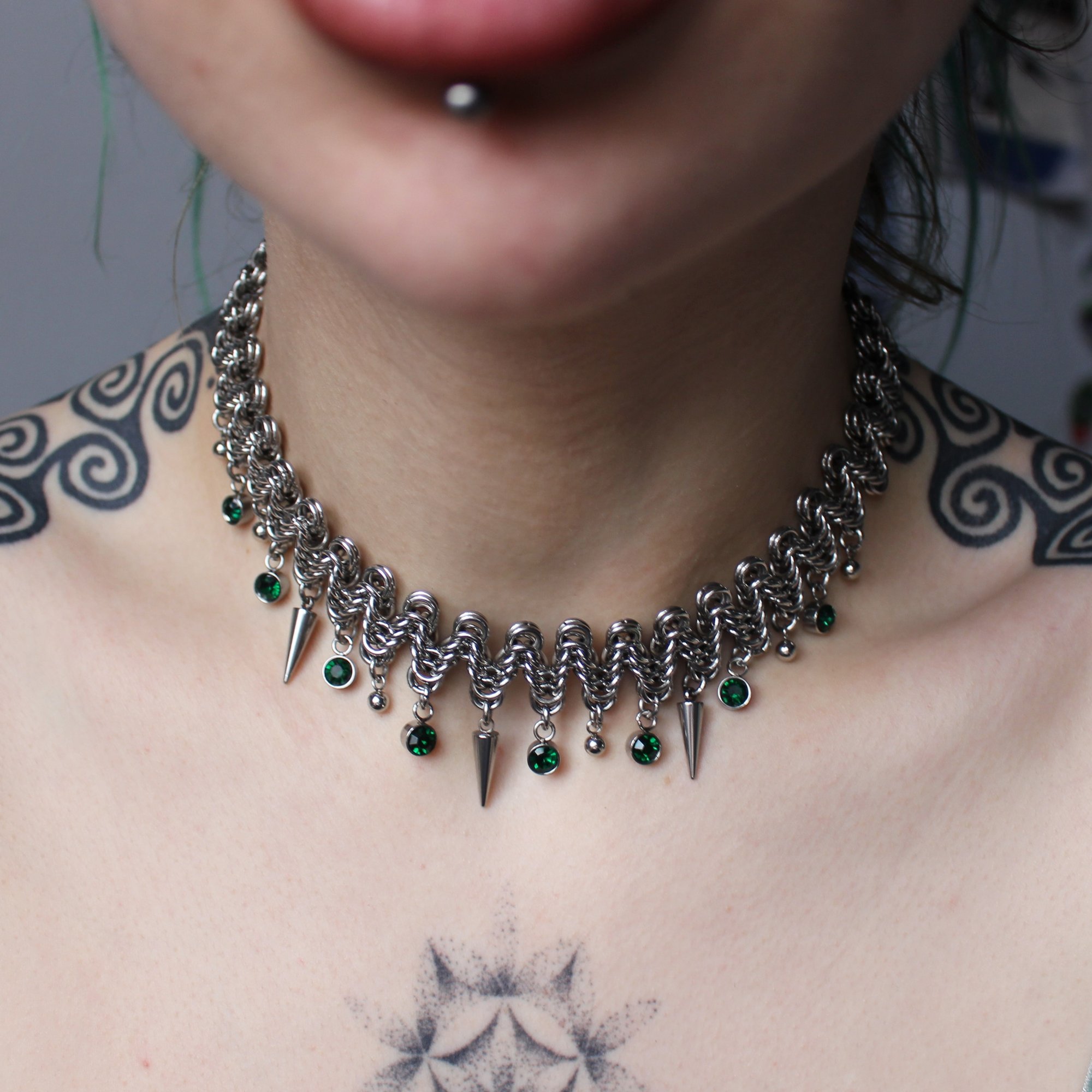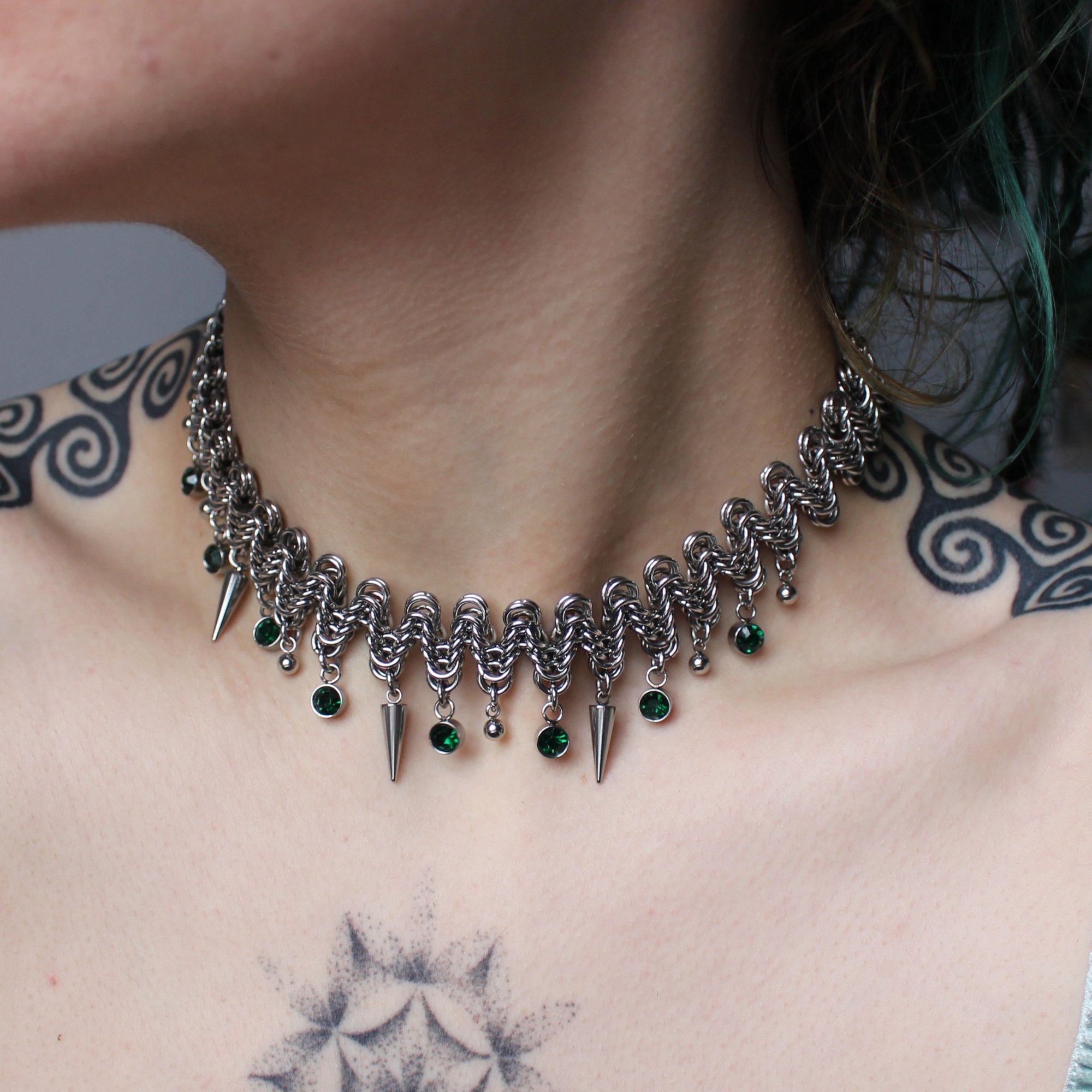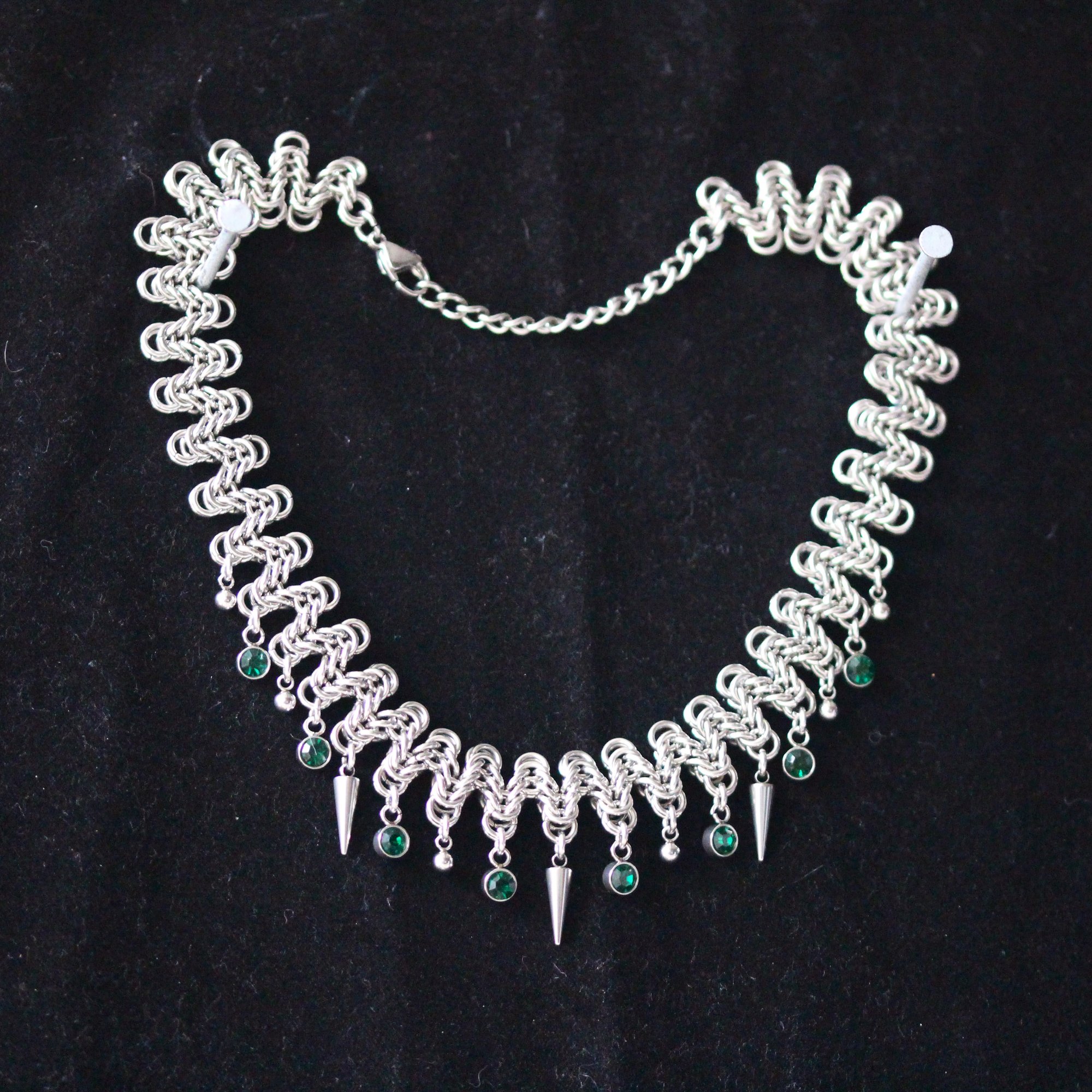 A stainless steel zigzag necklace with ball bearings, spikes and green glass charms.